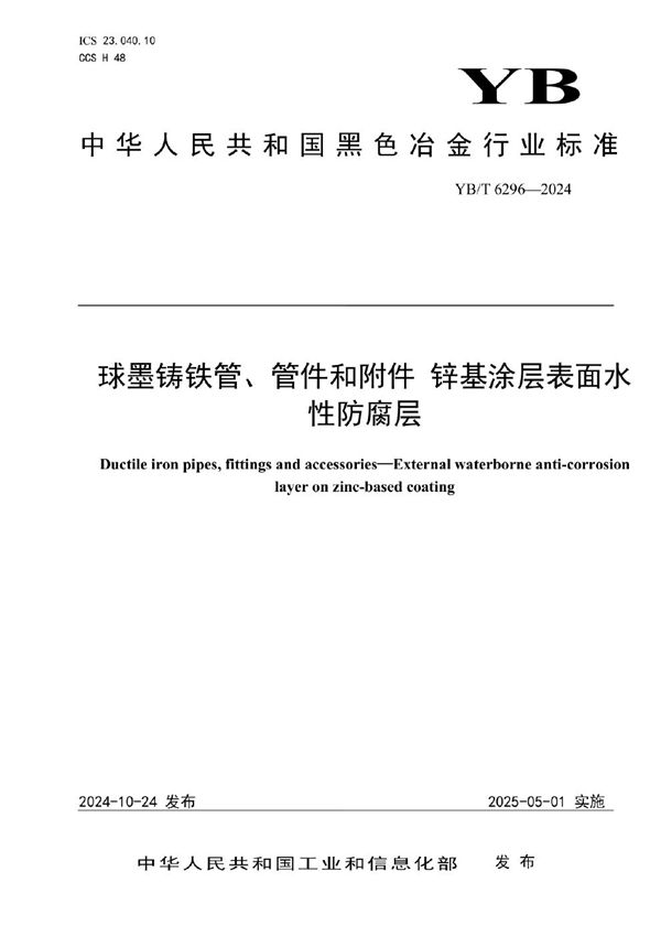 球墨铸铁管、管件和附件 锌基涂层表面水性防腐层 (YB/T 6296-2024)