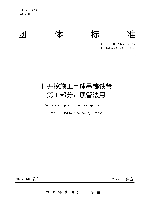 英文标题:Ductile iron pipes for trenchless application— Part 1:used for pipe jacking method