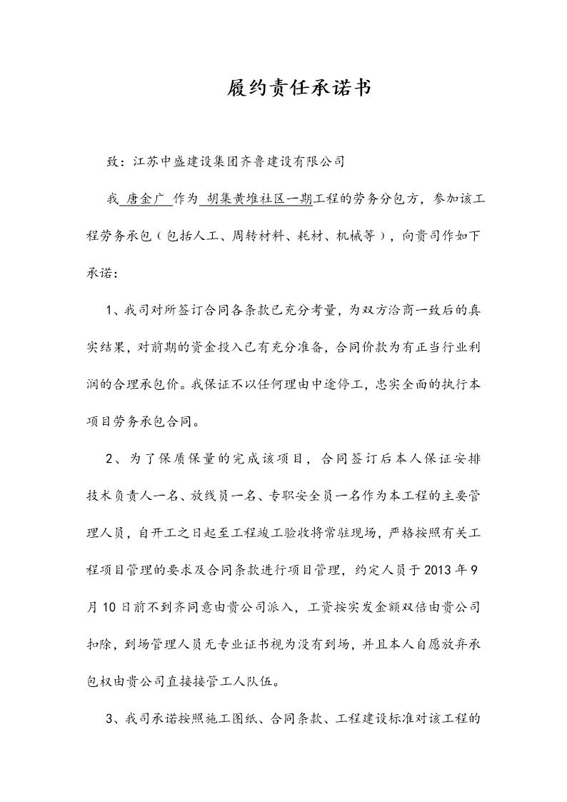 劳务分包履约承诺书 (劳务分包合同需不需要履约保证金)(3页)