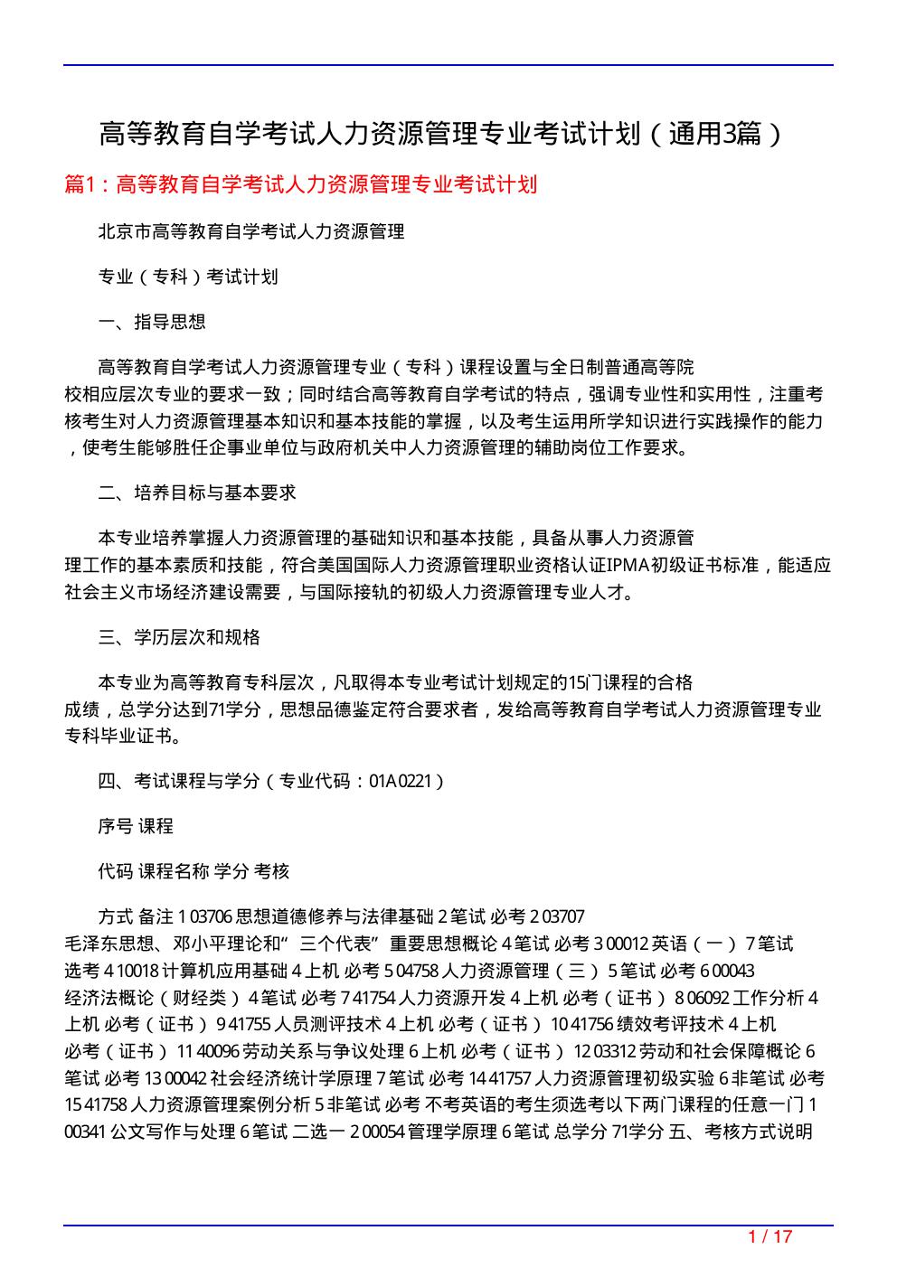 高等教育自学考试人力资源管理专业考试计划【3篇】