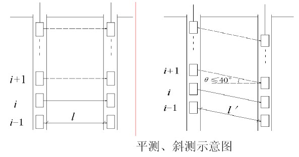 1 将发射与接收声波换能器通过深度标志分别置于两个声测管道中的测点处。平测时,发射与接收声波换能器始终保持相同深度(图a);斜测时,发射与接收声波换能器始终保持固定高差(图b),且两个换能器中点连线即声测的水平夹角不应大于30。