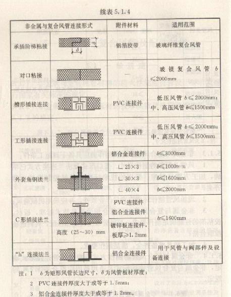 1.插接连接件或法兰应根据风管采用的连接方式,按本规范表5.1.4中关于附件材料的规定选用。