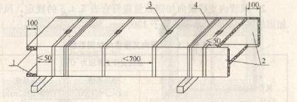 4.风管组装完成后,应在组合好的风管两端扣上角钢制成的П形箍,П形箍的内边尺寸应比风管长边尺寸大3mm~5mm,高度应与风管短边尺寸相同。然后用捆扎带对风管进行捆扎,捆扎间距不应大于700mm ,拥扎带离风管两端短板的距离应小于50mm(图5.4.4-2)。