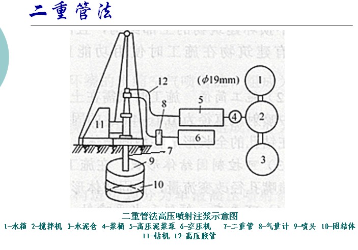1-水箱 2-搅拌机 3-水泥仓 4-浆桶 5-高压泥浆泵 6-空压机7-二重管 8-气量计 9-喷头 10-固结体 11-钻机 12-高压胶管