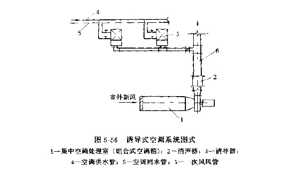 诱导式空调系统主要是将室外的新风集中进行处理(过滤、加热或冷却、加湿或减湿等),通过风机高速送人风道,称为一次风。一次风的风量可等于或稍大于所需的新风量即可。高速的一次风进入每个空调房间的诱导器内再进行对室内空气的冷却或加热处理。