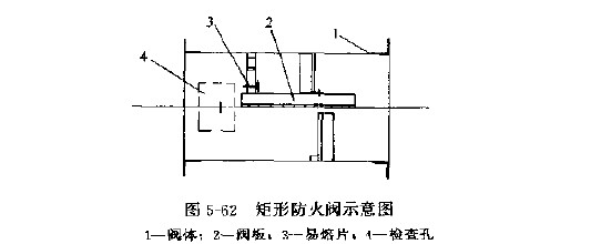 在空调系统的风道上,安装防火阀的目的是当发生火灾时能迅速切断输送的气流,防止火势蔓延。图5--62为防火阀简图,当出现火情时,风道受周围温度影响而温度升高,当火势使风道内达到一定温度时,易熔片熔断,原靠易熔片连接的阀板随即与易熔片脱开而关闭阻止气流通过。为了停止继续向系统送风、防火阀上安装电气信号和连锁装置,可使阀板在关闭时发出信号,使风机停止运转。