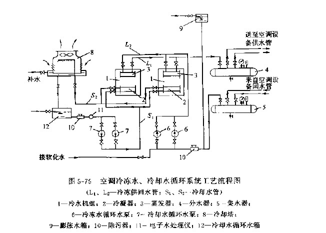 冷冻水、冷却水循环系统的工艺流程见图5---75。