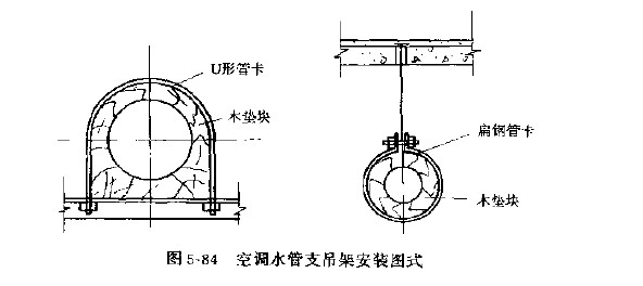空调水管支架多采用托架或吊架形式,当空调水管在夏季运行时,如管道直接与支架的型钢或吊架的扁钢接触,会产生冷桥现象,凝结水可沿支架下滴而破坏保温层。因此,在安装时在支架与管道接触面处做绝热处理,一般多采用经沥青煮过的木垫块或特制的塑料绝热吊架(图5--84)。