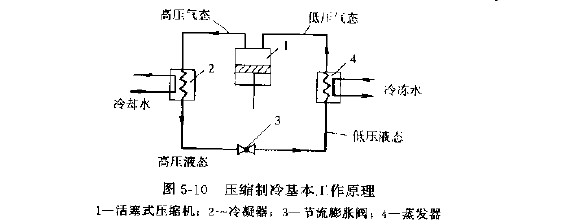 蒸气压缩式制冷的工作原理是使制冷剂在压缩机、冷凝器、节流膨胀阀和蒸发器等主要的热力设备中来完成四个热力过程:即制冷剂的压缩、蒸发吸热、节流膨胀和冷凝放热(见图5---10)。