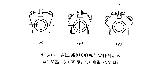活塞式压缩机有多种类型,根据工质可分氨压缩机和氟利昂压缩机;从气缸位置可分立式压缩机和卧式压缩机;从气缸数量而分有单缸、双缸和多缸压缩机,一般单缸和双缸压缩机多为立式或卧式,而多缸压缩机多呈V型、w型等(图5---15),即气缸有一定倾斜角度排列;还有开启式、半封闭式和全封闭式的压缩机,一般大型冷库等均采用开启式压缩机,即电机和压缩机轴端外露空气中,空调制冷压缩机多采用全封闭式压缩机,即将电机和压缩机封闭在同一罩体内;按与电机连接方式而分,有用皮带传动的和联轴器直联等类型。