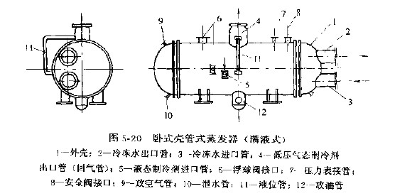 卧式壳管蒸发器(满液式)它的构造与卧式壳管式冷凝器类似(图5--20),卧式外壳的两端设有管板,管板间焊接数根带有肋片的铜管,管板端部有隔板,将管束间隔成几个管道回程,使管内的介质通过不断改变流动方向而增加与制冷剂的换热效率。
