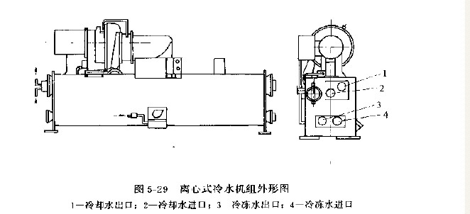 离心式水冷冷水机组因采用离心式压缩机,采用单机压缩可使其效率高、体积小(图5--29),在离心式压缩机吸入口处设有导叶阀,可通过自动凋节导叶的开启度来调节制冷剂的流量和压力。