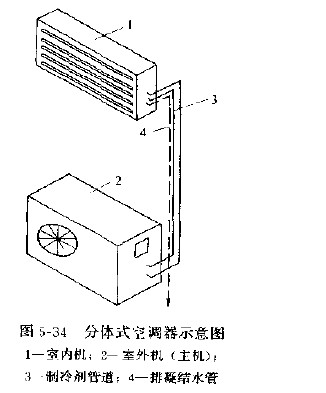 室外机组主要包括压缩机、冷凝盘管换热器、风机等设备,室内外机组连接有制冷剂管道、电源线和排凝结水软管(图5--34)。