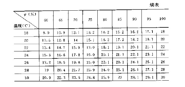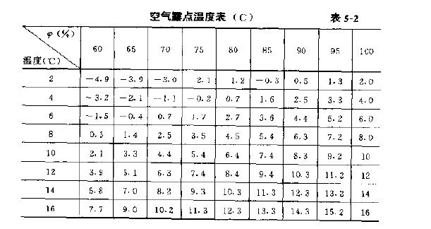 空气的结露往往会使空气中的含湿量降低。这在空调中具有较大的实用意义。夏季的空调冷冻水温一般在7℃左右,通过表面冷却器时,其冷却器内的盘管表面温度会低于通过冷却器需被冷却的空气温度。当其周围温度被冷却到露点温度以下时,其通过表面冷却器周围空气中的水蒸气在盘管表面结露,即空气中的水蒸气会从空气中分离出来,冷却后的空气即会达到降温去湿了。表5--2中表示在不同温度和湿度的空气露点温度值。