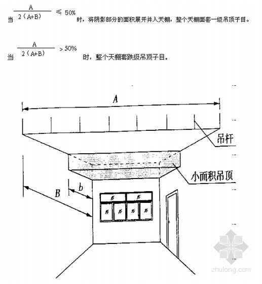 如图举例如下:阴影部分为小面积吊顶,级差长度为A,顶面周长为2(A+B)。