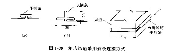 薄钢板风管之间连接不需采用法兰来连接,而是将风道两端头做处理后采用插条、抱箍等方法将其连接在一起的方法,称为无法兰连接。无法兰连接常采用的是插条连接。插条连接适用于矩形风管,只需将风管两端制成平咬口形状,然后将制好的擂条从端边插进,再压实即可(图4--39)。有折耳的插条在风管转角处应将其拍弯,包在相邻边上,再拍平即可。插条可分为平插条及立插条等形式。