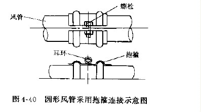 抱箍式连接(图4--40)是将圆形直管的两端轧出鼓筋,风管一端略大于另一端,将风管略小端插入另一段风管的较大端内,再做一特制的抱箍将其固定,将抱箍上的螺栓拧紧。这种方法要求抱箍鼓筋弧度与管端鼓筋弧度一致,两鼓筋间距相吻合,方可保证连接严密。