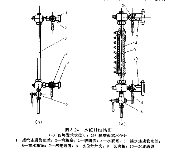蒸汽锅炉常用的水位计有玻璃管式水位计(图3--20a)和玻璃板式水位计(图3--20b)。