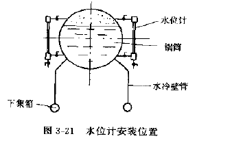 水位计与锅筒连接见图3--21.锅筒的水位通过连通管显示在水位计上。每台锅炉应在锅筒两侧各安装一个水位计,以便相互校正和更换。