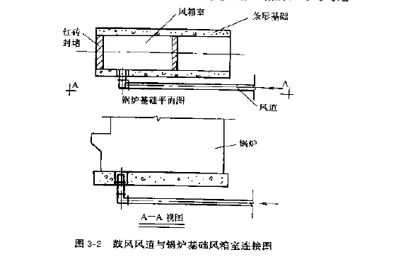 (3〕鼓风机的风道多采用1.5~2厚的钢板制作。鼓风机设置在风机间时,宜采用地下管道敷设方法,将空气送至炉排下的风室内。风室是采用两侧条形锅炉基础与炉排位置处前后封堵而成〔图3---2)。风室成为静压箱,空气进入静压箱后,可均匀地提供给炉排两侧供风管道用。炉排风道再通过调一节阀调整炉排不同燃烧段的煤层燃烧需用空气量。因此,要求在封堵风室时,应将杂物或泥土清扫下净。采用砖封时应保证严密,不允许有缝隙。封堵进风管处宜采用砖块堵后再抹水泥砂浆。