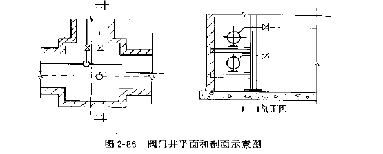 当采用地沟敷设时,凡在较大分支管路上应设置阀门井,便于调节控制和维修。阀门井多为砖砌制,可根据控制支干线的数量和管径分为圆形阀门井和矩形阀门井,为维修方便多采用矩形井。矩形井的几何尺寸根据井内阀门的数量、管径、检修空间而定。图2---86为阀门井平面布置和连接支管阀门的图示。