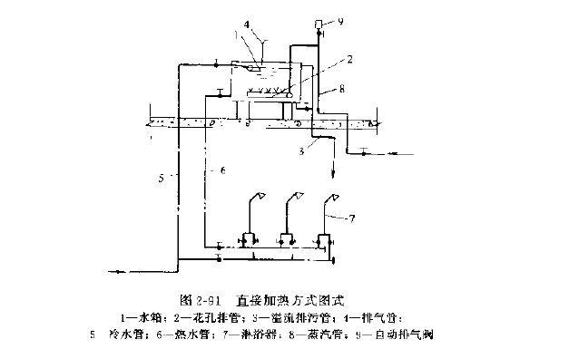 采用直接加热方式时,一般均采用蒸汽作为热媒。将蒸汽接在被加热的水箱内一带有孔眼的蒸汽排管上(图2--91) ,蒸汽直接从孔眼内喷出。将水箱内的水加热。