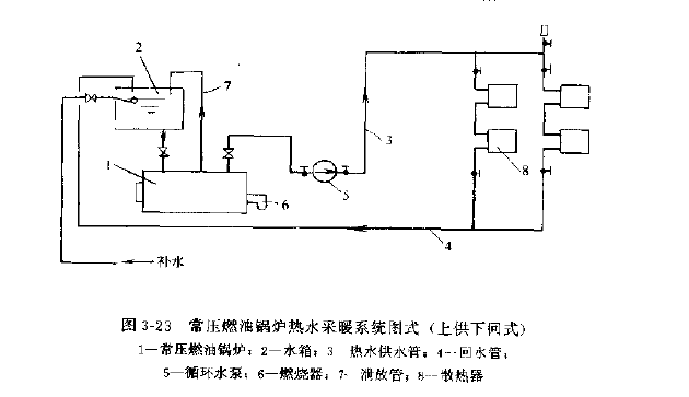 图3---23为上供下回式采暖系统,主要由常压锅炉、循环水泵、水箱及系统管道、阀门等组成,其中泄放管接至水箱。