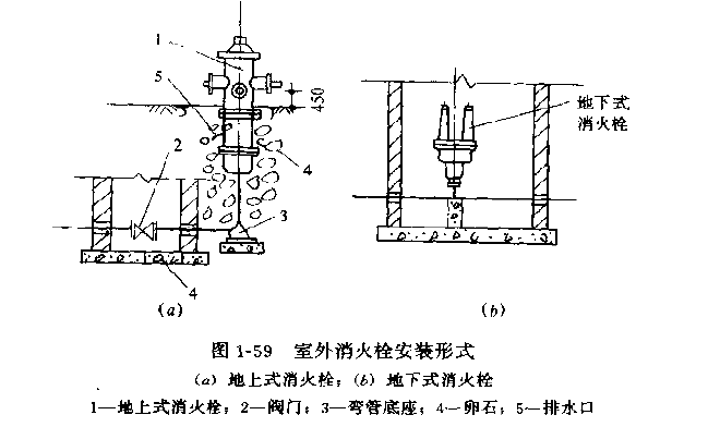 (3)消火栓井;室外消火栓主要设置在厂区、仓库区、商业区、大型群体公共建筑区内,一旦建筑内外发生火灾能及时接通消防设备灭火,并提供消防车取水灭火用。室外消火栓可根据当地的气温状况选择地上式消火栓及地下式消火栓(图1---59)。