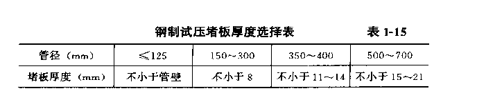 为方便给水铸铁管进行强度试验,一般多采用钢制堵板,堵板的厚度应保证在强度试验时能承受在该堵板上的力,并使其不变形。理论上应进行力的计算来选择其厚度,但用于给水系统中,当试验压力不超过1.0MPa时,可参照表1--15选择。