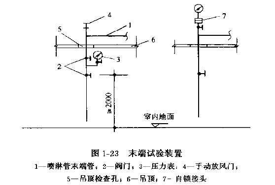 在自动喷淋系统安装完毕进行初调试时,为了测试系统的水流指示器等部件的动作情况,不可能去破坏喷头进行喷水,而是通过末端装置来进行实验。即打开图1---23中的阀门2放水,此时系统内的水即会通过该分支(分层)的水流指示器并接通电源触点,同时反馈到中心控制台上。如此试验应反复几次以检测其动作的准确性。试验完毕关闭泄水阀,此时压力表即显示该分支系统的水压情况。
