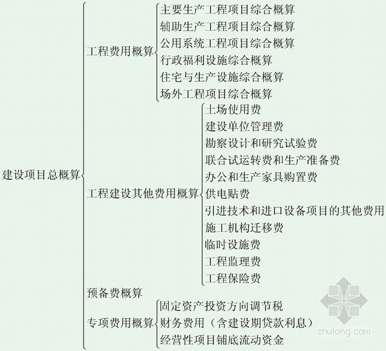 建设项目总概算是确定整个建设项目从筹建到竣工验收、交付使用时所需全部费用的文件。它是由各个单项工程综合概算、工程建设其他费用概算、预备费和投资方向调节税概算等汇总编制而成的,