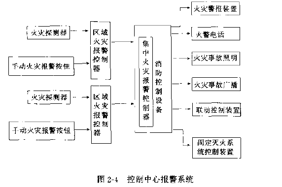 控制中心报警系统由火灾探测器、手动火灾报警按钮、区域火灾报警控制器、集中火灾报警控制器和消防控制设备等组成。适用于大型建筑的保护。系统的容量较大,能完成较复杂的输出控制程度,消防设施控制功能较全,系统构成见图2一4。