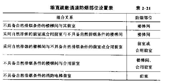 当防烟楼梯间及其前室、消防电梯前室或合用前室各部位有可开启外窗时,能采用自然排烟方式,造成楼梯间与前室或合用前室在采用自然排烟方式与采用机械加压送风方式排列组合上的多样化,而这两种排烟方式不能共用。这种组成关系及防烟设施。设置部位分别见表2-21