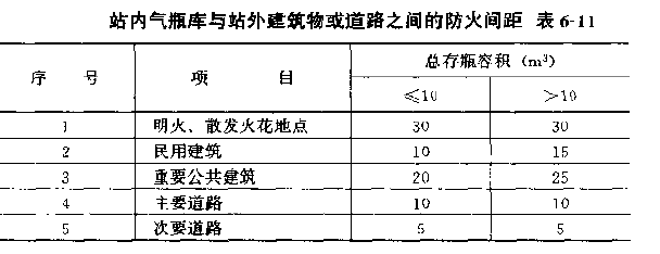 (1)站内气瓶库与站外建筑物或道路之间的防火问距,不应小于表6--11的规定。