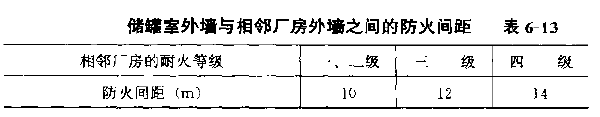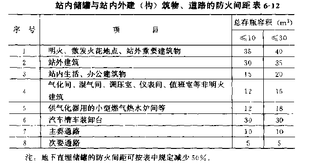(1)站内储罐与站内外建(构)筑物或道路的防火间距不应小于表6--12的规定。