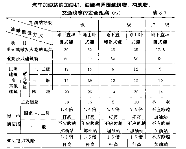 (3)汽车加油站的加油机、油罐与周围建筑物、构筑物、交通线等的安全距离,不应小于表6一7的规定。