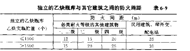 (6)独立的乙炔瓶库与其他建筑物和屋外变、配电站之间的防火间距,不应小于表6一9的规定。