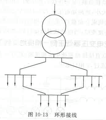 环形接线的观点可靠性较高,任何一条线路发生故障或检修时都不至于供电中断。另外.该接线的电能损耗和电压损耗较少。但该接线的保护装置整定装配比较困难,若配合不好易产生误动作影响正常的供电。接线如图10--13所示:
