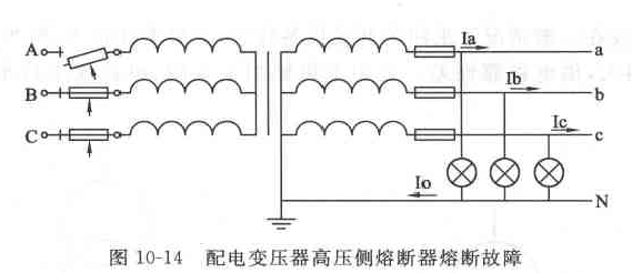 答:图10--14所示为高从侧A相熔断器断开后的情况口此时.配电变压器低胀侧a相电压为零。实际土受配电变压器铁芯中不平衡磁通的影响.低压侧a相绕组会感应出电压,这个电压较小.有时可使电灯灯丝发红。其余两相b,c相的电压为原电怅的0.866倍,b,c相电灯亮度比正常时要暗些。