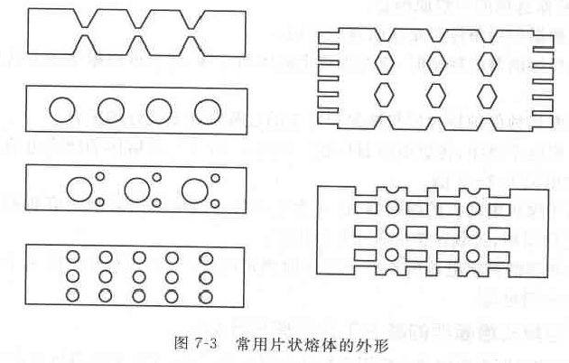 答:常用熔体的形状一般分为丝状和片状两种。其中,丝状熔体多用于小电流的场合;片状熔体一般用薄金属片冲压制成而且常带有宽窄不等的变截面,或在条形薄片上冲成一些小孔,不同的形状可以改变熔断器的保护特性.常用片状熔体的外形如图7--3所示。