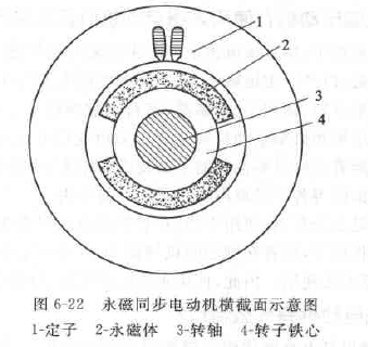 答:永磁同步电动机的定子与电励磁同步电动机的定子相同,定子绕组采用对称三相短距、分布绕组只是转子上用永磁体取代了直流励磁绕组和主磁极。如图6--22所示。