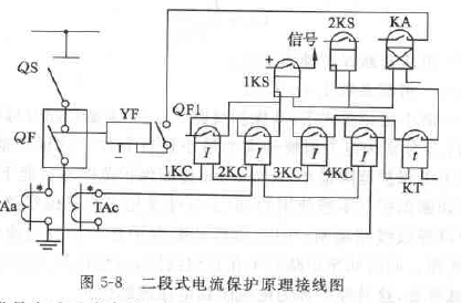 图5-8中第一段是电流速断保护,有电流继电器1KC,2KC和信号继电器1KS组成;第二段是定时限过电流保护由电流继电器3KC,4KC,时间继电器KT和信号继电器2KS组成。中间继电器KA是二段电流保护公用的出口继电器。