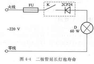 答:灯泡的使用寿命是有限的但在楼梯、走廊、厕所等照明亮度要求不高的场所,可采用申联二极管的方法来有效地延长灯泡寿命。即在拉线开关内加装一只耐压大于400v,电流为1A的整流管。如图4--4所示.