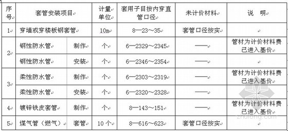 答:管道安装工程中的套管在套用子目时,按内穿直管的口径套用定额子目。具体按下表执行。