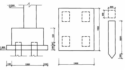 【例】图为预制钢筋混凝土桩,柴油打桩机打桩,二类土,计算桩基的制作、运输、打桩、打送桩以及承台的工程量(30根)。