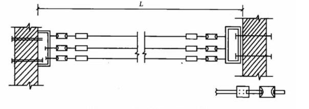 附注:针式绝缘子导线安装定颇是按单根延长米计算的,实际有多少根,工程量就乘以多少倍。车间带形母线安装相线是按三相延长米计算的,已考虑高空作业,计算工程量按单根长度计算,不用乘以3倍。工作零母线定额采用钢母线,按单根编制。各种母线工程计算时从固定支架一端计算到另一端,也就是两堵内侧净跨度,如图所示。