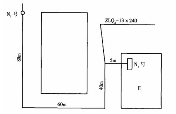 【例】如图所示,电缆自N1电杆引下埋设至11号厂房N1动力箱,动力箱为XL(F)一15一0042,高1.7m,宽0.7m,箱距地面高为0.4m。试计算其工程量。