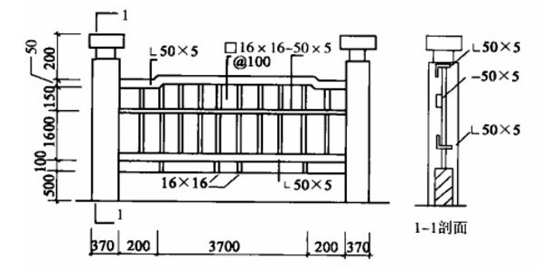 如图所示,围墙方钢栏杆共60榀,其工程量按设计图纸几何尺寸,以吨为单位计算重量。