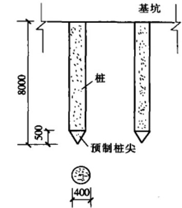 【例】某工程处理湿陷性黄土地基,采用冲击沉管挤密灌注粉煤灰混凝土短桩,如图所示,试计算其工程量(共985根桩)。
