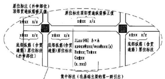基础梁集中标注中下部钢筋用B打头,上部钢筋用T打头(04G101-3,P7 /11G101-3,P22)。